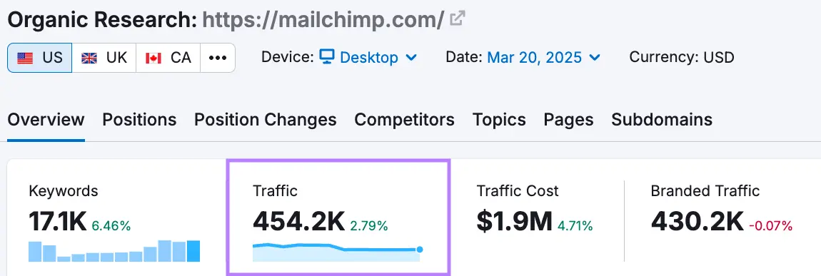 Theo công cụ Nghiên cứu hữu cơ của Semrush , trang này nhận được hơn 454 nghìn lượt truy cập hữu cơ mỗi tháng.