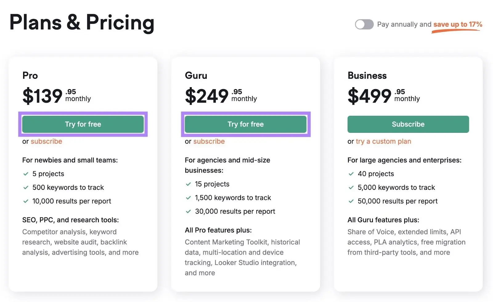 Ví dụ, Semrush cung cấp bản dùng thử miễn phí bảy ngày. Điều này cho phép người dùng mới có toàn quyền truy cập vào gói Pro hoặc Guru.