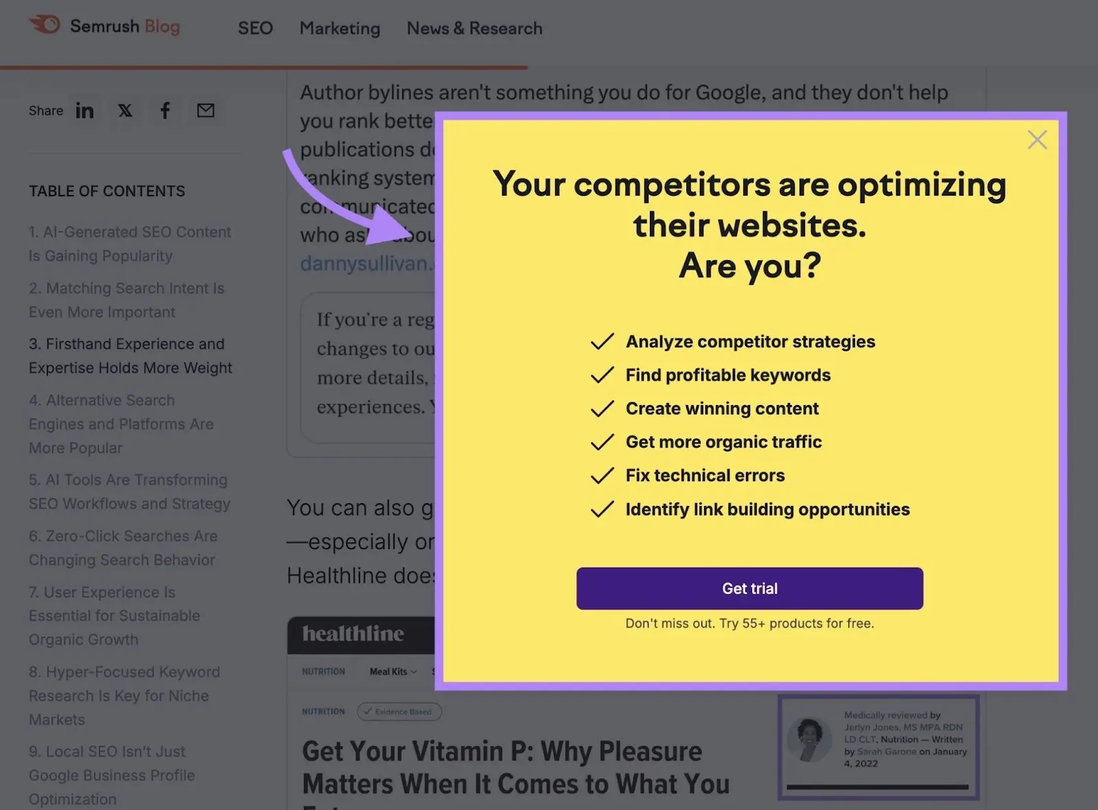 Các bài đăng trên blog Semrush có cửa sổ bật lên khi cuộn trông như thế này: