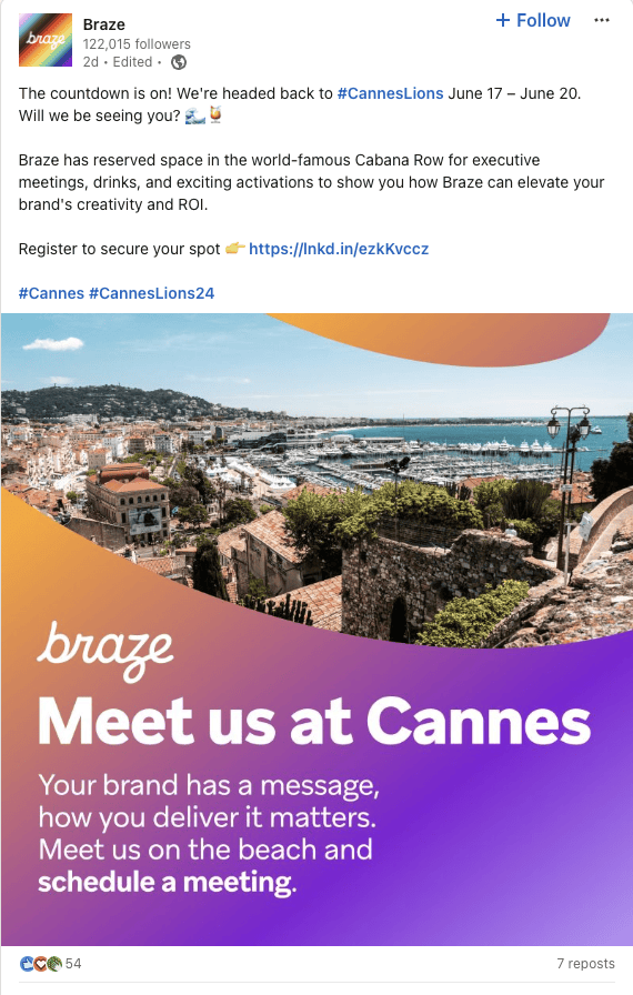 Tất cả các sáng kiến của họ đều gắn liền với khẩu hiệu đầy cảm hứng, “Chưa bao giờ có thời điểm nào tốt hơn để trở thành một nhà tiếp thị giỏi hơn. Hãy hoàn toàn thu hút”. Từ chương trình roadshow nhiều thành phố đến mọi thứ họ đang làm trong lĩnh vực kỹ thuật số, sứ mệnh giúp các thương hiệu thúc đẩy sự tương tác luôn được đặt lên hàng đầu. Chiến lược khuếch đại thương hiệu được dàn dựng tốt của Braze minh họa cho sức mạnh của sự nhất quán và điều gì xảy ra khi tất cả các hoạt động kích hoạt của bạn đều hướng đến cùng một trụ cột.