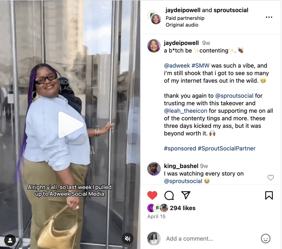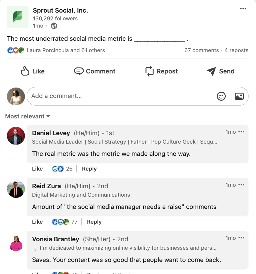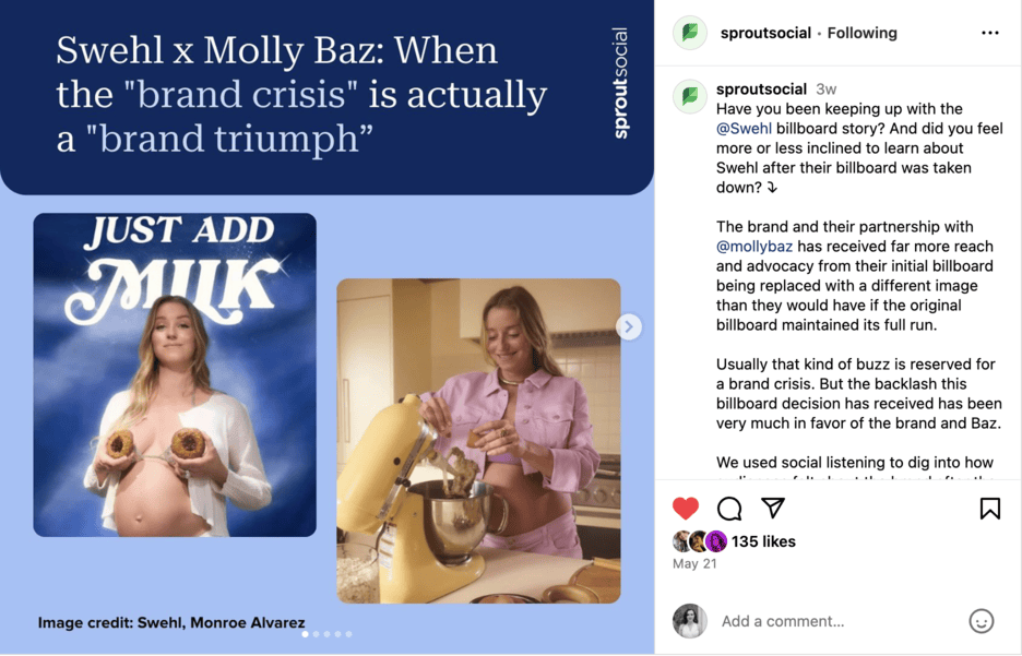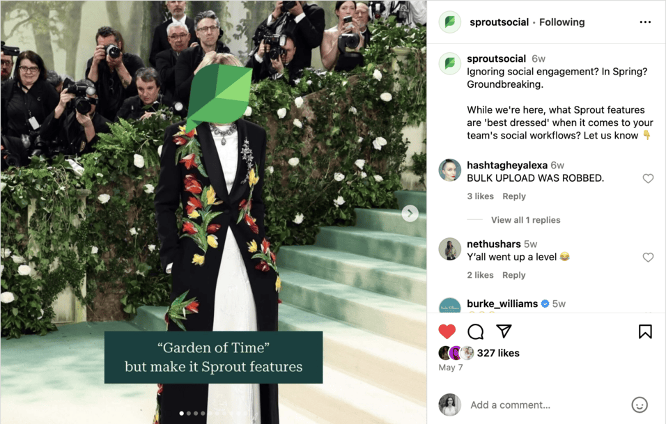 Lý tưởng nhất là bạn muốn tham gia, bắt đầu và tích cực tham gia vào các cuộc trò chuyện thay vì phát tán nội dung quảng cáo 24/7. Việc đưa thương hiệu của bạn vào tinh thần văn hóa thời đại sẽ hiệu quả hơn nhiều so với việc liên tục chia sẻ các bản cập nhật không thực sự đáng đưa tin. Ví dụ, khi nhóm truyền thông xã hội của Sprout chia sẻ một vòng quay về các khả năng của chúng tôi “ăn mặc” như những người tham dự Met Gala, họ đã sáng tạo gắn kết thương hiệu của chúng tôi với một khoảnh khắc văn hóa hiện tại.