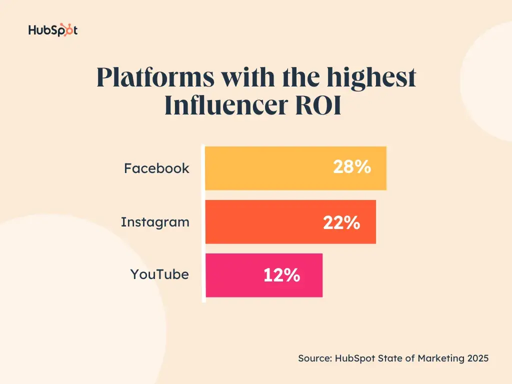Kênh tốt nhất thực sự phụ thuộc vào đối tượng mục tiêu của bạn, vì vậy hãy đào sâu vào dữ liệu của bạn để xem họ đang tụ tập và tiêu thụ nội dung ở đâu, nhưng nhìn chung, nghiên cứu của HubSpot cho thấy các nhà tiếp thị thấy ROI cao nhất từ những người có sức ảnh hưởng trên Facebook (28%), Instagram (22%) và YouTube (12%).