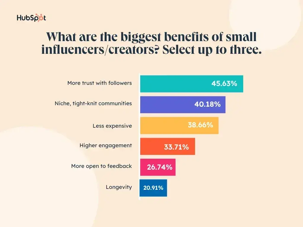 Có được một người nổi tiếng có sức ảnh hưởng như Mr. Beast có thể rất thú vị, nhưng khảo sát của chúng tôi cho thấy cả thương hiệu B2B và B2C đều đạt được thành công lớn nhất với những người có sức ảnh hưởng nhỏ (10.000 – 100.000 người theo dõi) vào năm 2024.
