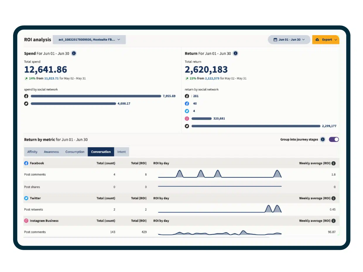Với Advanced Analytics của Hootsuite , việc thúc đẩy doanh số và mức độ tương tác trở nên dễ dàng hơn bao giờ hết. Công cụ này làm nổi bật những gì đang hiệu quả và những gì không hiệu quả, để bạn có thể tập trung vào các hoạt động hiệu quả nhất của mình . Theo dõi doanh số, lượt đăng ký và chuyển đổi từ các bài đăng cụ thể và sử dụng thông tin này để tạo nội dung thực sự hiệu quả.