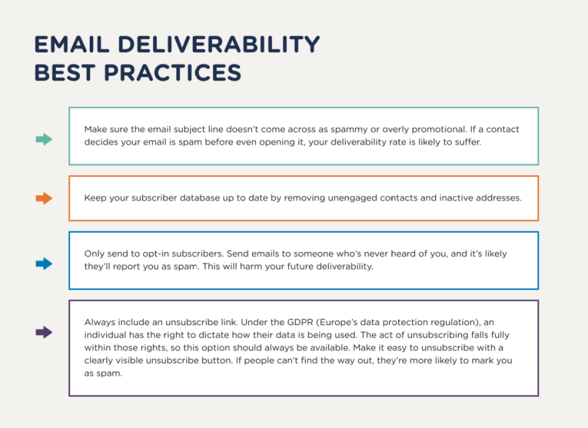 Khả năng phân phối email đề cập đến khả năng phân phối email đến hộp thư đến. Khả năng phân phối email tốt đảm bảo rằng email của bạn đến được hộp thư đến của người đăng ký chứ không phải thư mục thư rác của họ. Để cải thiện khả năng phân phối, hãy tránh các dòng tiêu đề thư rác hoặc quảng cáo quá mức, hãy cập nhật cơ sở dữ liệu người đăng ký của bạn bằng cách xóa các liên hệ không tương tác, chỉ gửi email cho những người đăng ký đã chọn tham gia và luôn bao gồm liên kết hủy đăng ký.