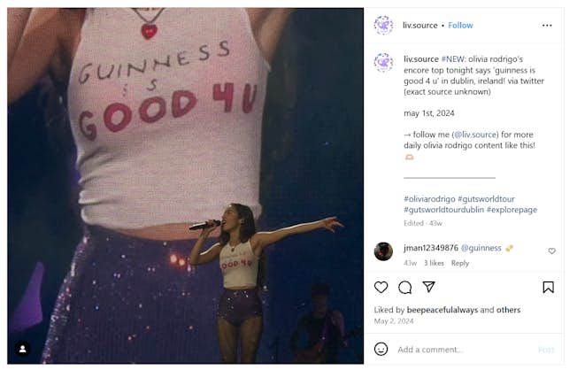Bài đăng trên IG của Olivia Rodrigo mặc áo phông ‘Guinness is Good 4 U’ trong buổi hòa nhạc