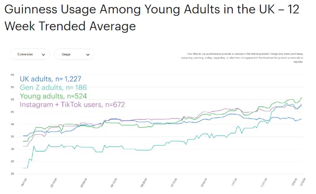 Ví dụ, trong khi Guinness đã tích cực thu hút người tiêu dùng trẻ tuổi trong nhiều năm thông qua quảng cáo và tiếp thị có sự ảnh hưởng , thì một bước đột phá lớn đã đến vào năm 2023. Kim Kardashian đã đăng một bức ảnh đang uống Guinness, tiếp theo là Olivia Rodrigo mặc chiếc áo phông “Guinness is Good 4 U” khi biểu diễn ở Dublin vào năm sau.