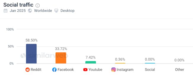 Khi bạn xem xét lưu lượng truy cập trang web trên Similarweb tới Guinness.com từ các kênh mạng xã hội, kênh thu hút nhiều nhất cho đến nay là Reddit dựa trên cộng đồng với 58,5%, so với Facebook là 33,7% và YouTube là 7,4%.