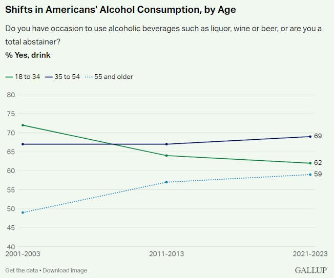 Cũng có xu hướng ngày càng tăng là mọi người uống ít rượu hơn. Nghiên cứu của Gallup cho thấy 62% người lớn dưới 35 tuổi cho biết họ uống rượu, giảm 10% so với hai thập kỷ trước. Và những người trẻ tuổi như Gen Z uống ít thường xuyên hơn và ít có khả năng uống quá mức.