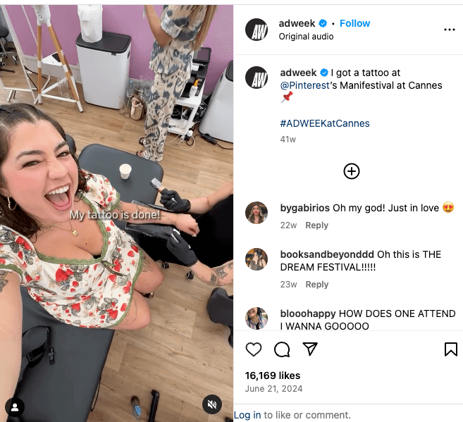 Màn hình tương tác là phương tiện mạnh mẽ để thu hút khán giả tại các sự kiện trực tiếp. Tại Cannes, Pinterest đã tổ chức Manifestival bao gồm nhiều gian hàng tương tác liên quan đến các xu hướng và tính năng của mạng lưới. Những người tham dự có thể làm mọi thứ từ vòng tay quyến rũ đến giày nhuộm màu và xăm hình tùy chỉnh. Những trải nghiệm này đã mang cộng đồng trực tuyến của Pinterest trở nên sống động, giải trí cho khán giả đồng thời tạo ra nội dung có giá trị do người dùng tạo ra (UGC) để chia sẻ trên mạng xã hội.
