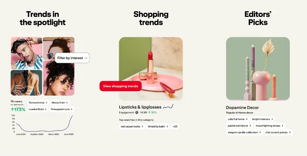 - Lựa chọn của biên tập viên – Cung cấp các xu hướng văn hóa được hỗ trợ bởi dữ liệu, gây được tiếng vang với người dùng do Biên tập viên Pinterest tuyển chọn thủ công. Các thương hiệu có thể phản hồi các khoảnh khắc văn hóa bằng cách biến những xu hướng này thành các chiến dịch nổi bật thông qua Tài trợ biên tập.