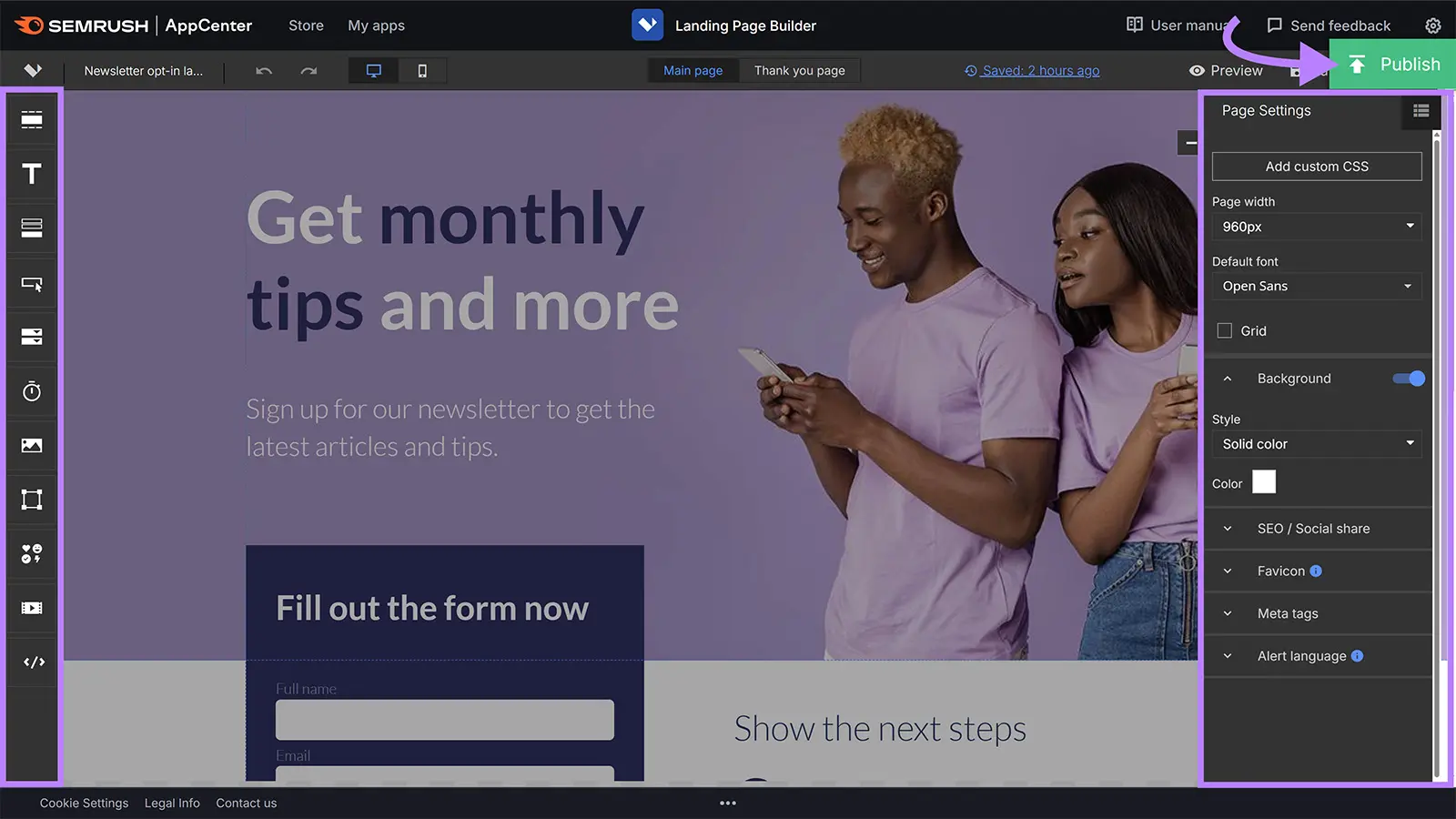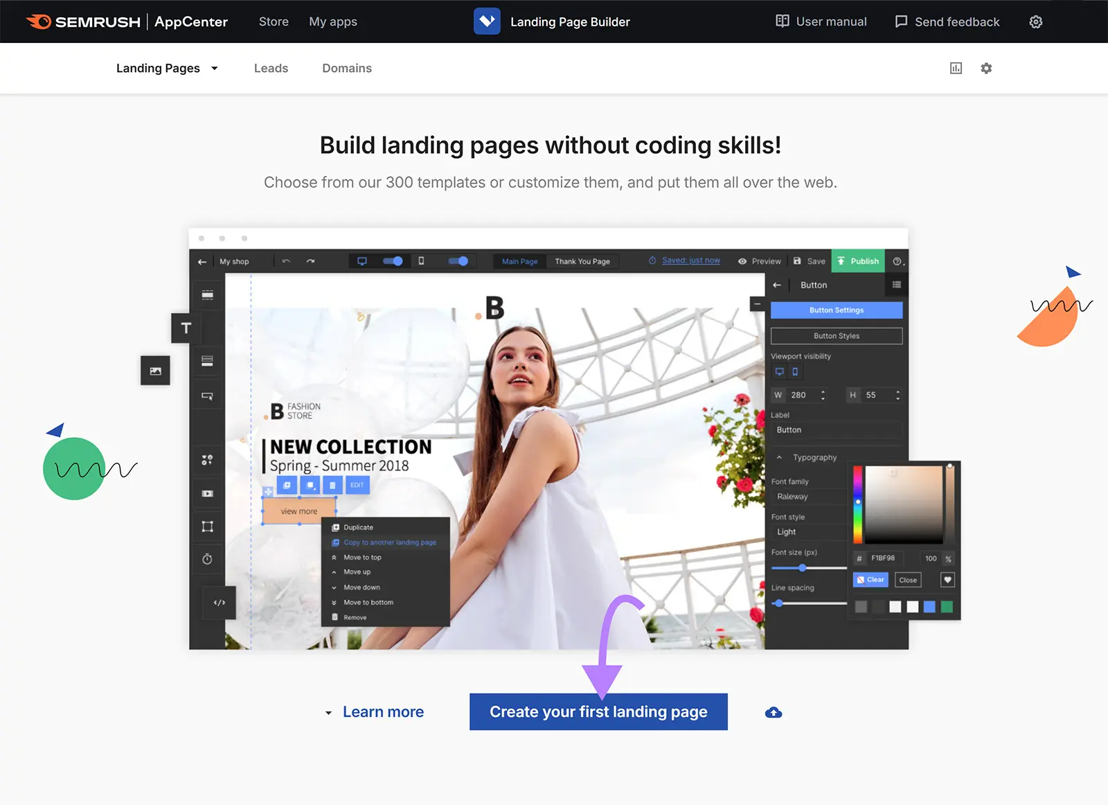 Trình tạo trang đích kéo và thả của Semrush giúp bạn xây dựng các trang đích và thử nghiệm A/B các yếu tố khác nhau. Để đảm bảo các trang đích của bạn chuyển đổi được nhiều khách truy cập nhất có thể.