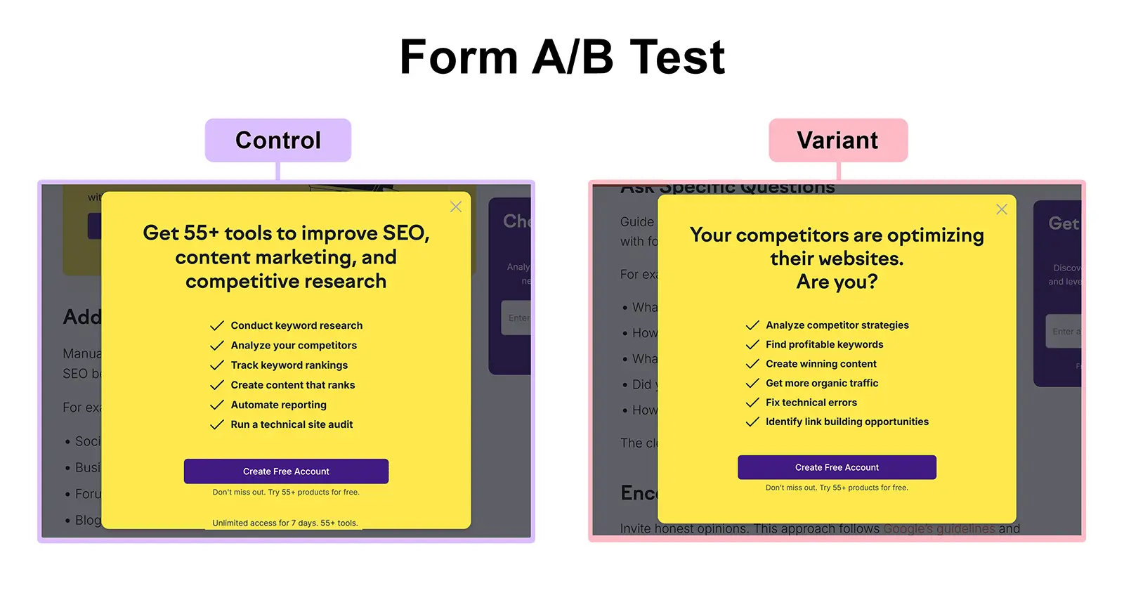 Đây là bản kiểm soát và biến thể cho thử nghiệm bật lên của chúng tôi. Chúng tôi đã thay đổi thông điệp nhưng vẫn giữ nguyên thiết kế.