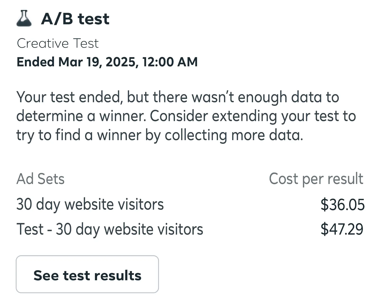 Hầu hết các nền tảng thử nghiệm A/B sẽ xác định ý nghĩa thống kê cho bạn. Giống như những kết quả này cho thử nghiệm A/B quảng cáo trên Facebook: