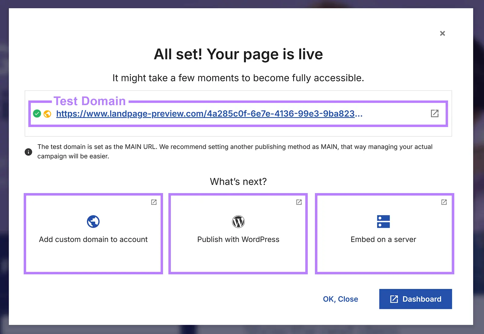 Bạn sẽ nhận được một tên miền thử nghiệm cùng với các tùy chọn để thêm trang đích vào trang web và tên miền của riêng bạn.