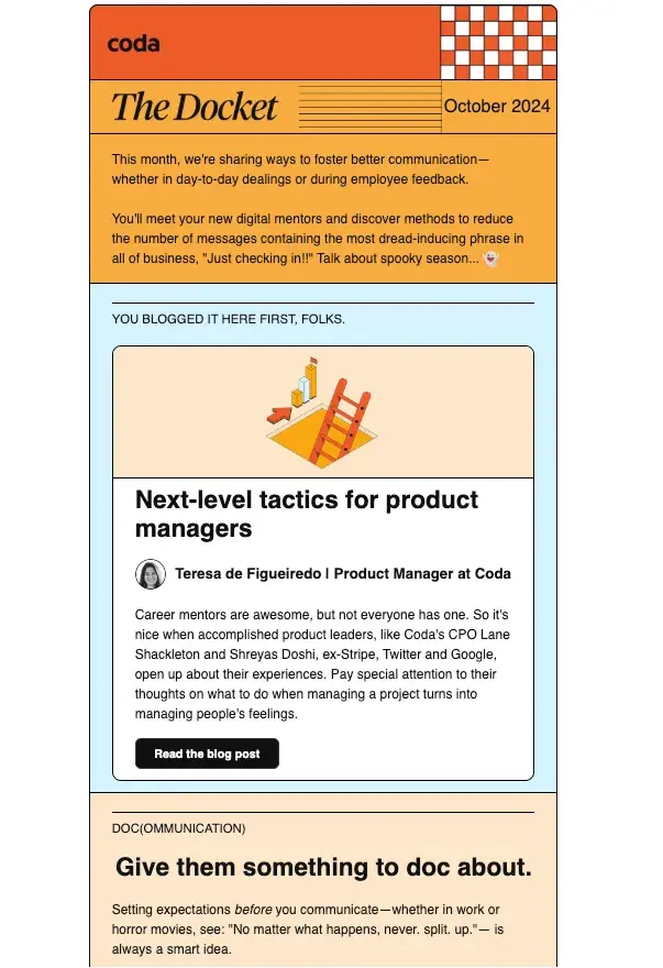 Docket là bản tin hàng tháng của Coda , một trình soạn thảo tài liệu cộng tác và không gian làm việc cộng tác tất cả trong một. Bản tin kết hợp các mẹo về sản phẩm, cập nhật và nội dung hữu ích cho những người làm việc trí óc. Coda đang trong quá trình được Grammarly mua lại (một thương hiệu khác có trò chơi email tuyệt đỉnh!), vì vậy tôi rất mong chờ xem thương hiệu và nội dung email sẽ phát triển như thế nào.