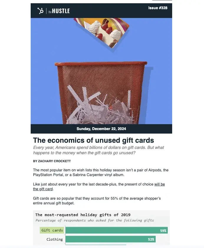 Với hơn hai triệu người đăng ký, The Hustle tập hợp các tiêu đề thú vị nhất trong tuần, các tính năng kinh doanh gốc và nội dung video và podcast vào email hàng ngày và hàng tuần. Tôi thích khám phá các bài viết kịp thời mà tôi không biết mình cần, như bài viết về hoạt động kinh doanh của các công viên giải trí Halloween.
