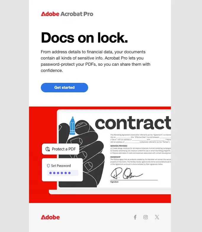 Adobe là một trong những thương hiệu yêu thích của tôi và điều đó cũng đúng với tiếp thị qua email của họ. Tôi không bao giờ cảm thấy bị ngập trong email của Adobe—không có gì thừa thãi—và nội dung của họ luôn ngắn gọn, trực quan sắc nét và rõ ràng.