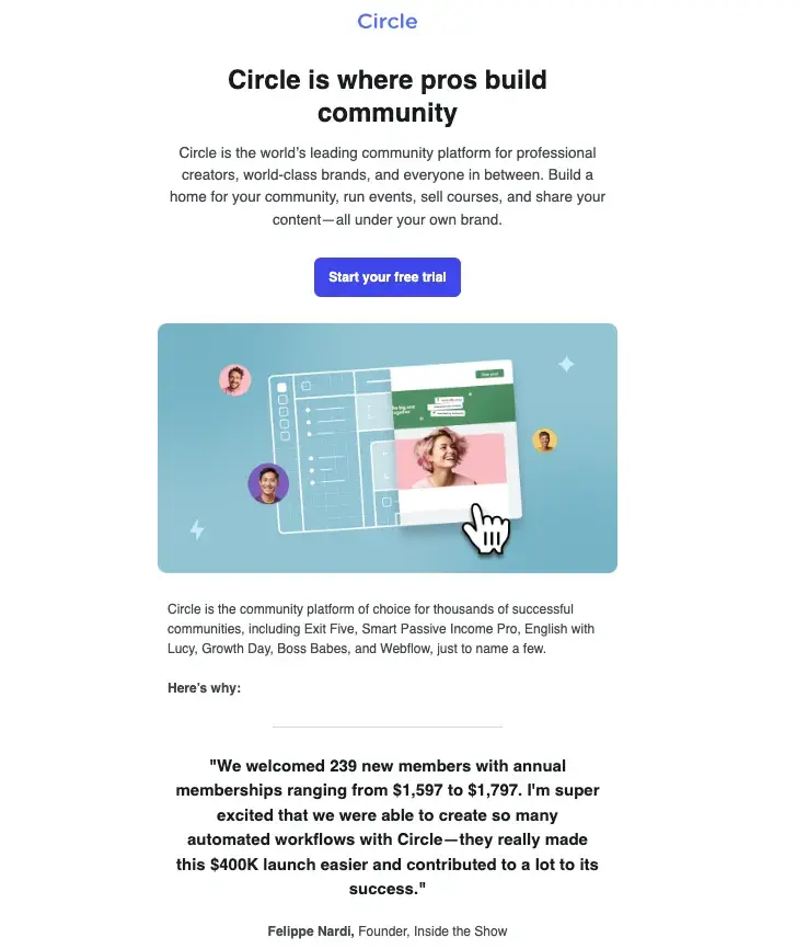 Điều tôi thích: Email của Circle mang lại hình ảnh thương hiệu nhất quán và nội dung có liên quan cho những người xây dựng cộng đồng. Tôi thích rằng nhiều email của họ đến từ một người cụ thể trong nhóm của họ (như “Alexis tại Circle”) nên nó không chỉ là một email thương hiệu vô danh. Tôi cũng thích cách họ sử dụng tiếng nói của khách hàng. Ví dụ, email nuôi dưỡng ở trên chỉ có một đoạn tóm tắt ngắn và CTA, trong khi ba phần tư nội dung có tiếng nói của khách hàng thông qua các trích dẫn lời chứng thực.