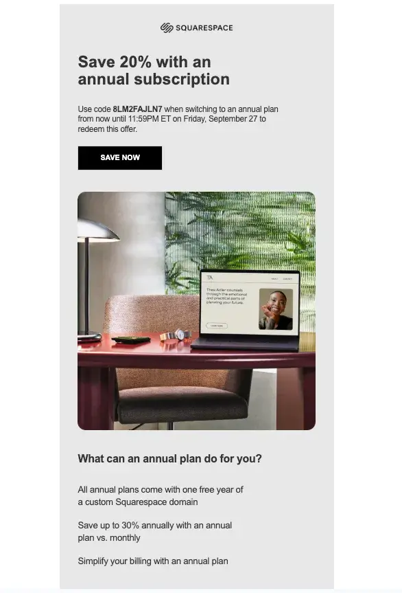 Một trong những sai lầm phổ biến mà các thương hiệu mắc phải là nhồi nhét quá nhiều thứ vào email bán hàng. Hãy xem email chào hàng này từ Squarespace : bằng cách giữ cho nó ngắn gọn và chỉ tập trung vào một ưu đãi, khuyến khích và CTA, họ tăng cơ hội người đọc sẽ chuyển đổi.