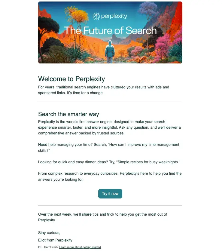 Perplexity tự gọi mình là “công cụ trả lời đầu tiên trên thế giới” và là giải pháp thay thế tìm kiếm hợp lý, được hỗ trợ bởi AI. Vì Perplexity là một danh mục công nghệ mới, nên trình tự hướng dẫn sử dụng của nó cực kỳ quan trọng để giáo dục người dùng về những gì họ có thể làm với ứng dụng trước khi thời gian dùng thử miễn phí kết thúc. Việc hoàn thiện email hướng dẫn sử dụng của bạn giúp bạn thu hút người dùng và tránh tình trạng mất khách hàng.