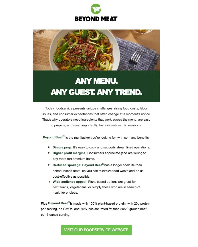 Điều tôi thích: Beyond Beef mang giọng điệu thương hiệu táo bạo, nồng nhiệt và đôi khi là bất kính vào tiếp thị qua email. Nó sử dụng hình ảnh hấp dẫn và CTA để nổi bật với đối tượng khách hàng bận rộn là các nhà hàng và đơn vị cung cấp dịch vụ ăn uống.