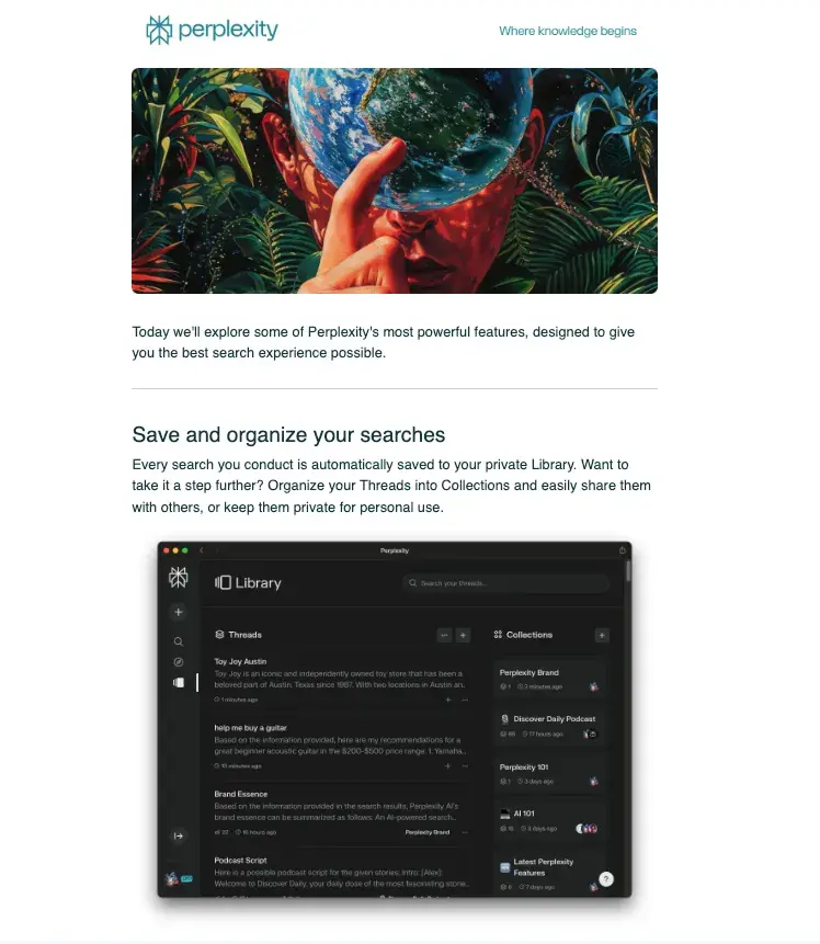 Điều tôi thích: Chuỗi hướng dẫn sử dụng của Perplexity bao gồm bảy email (nằm trong dòng tiêu đề: 4/7, v.v.) hướng dẫn người dùng qua các trường hợp sử dụng tốt nhất của ứng dụng. Chúng chứa hình ảnh anh hùng nổi bật và ví dụ sản phẩm cụ thể với hình ảnh và lời nhắc.